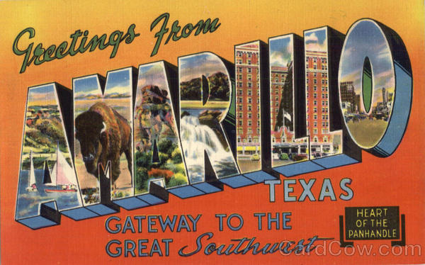 Front: Gentimgs From TEXAS GATEWAY TOO THE GREAT Southunest HEART OF THE PANHANDLE Back: K3319 A "Colourpicture" Publication, Boston 15, Mass., U.S.A. Sold by West Texas News Agency, Amarillo, Texas