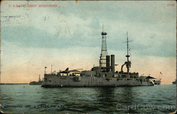 Front: U. S BATTLESHIP WISCONSIN. LAC COPYRIGHTED 1909 A.C. BOSSELMAN & Co. LI 11179 Back: 30 NOV Thy Address Newport Naval Miss Coral. Kelly Station Canobie Lake Defin W. H. Barrack C 300 1-2 div. R. I.p me Deaconx get Plaguro Stam not