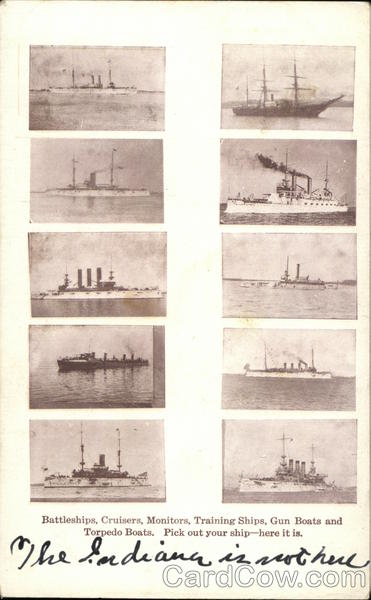 Front: Battleships, Cruisers, Monitors, Training Ships, Gun Boats and Torpedo Boats. Pick out your ship-here it is. The Indiana is not here Back: 4,00 No Annie allie PUT ONE CENT STAMP OVER ME