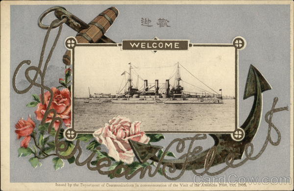 Front: SERR WELCOME ELC Conterno Issued by the Department of Communications in commemoration of the Visit of the American Fleet. Oct. 1908. ↑ Back: 製社會式株刷印京東 行發省信遞 RS 15 FH Printed by the Tokyo Printing Co., L'd. 手法便 郵 RS