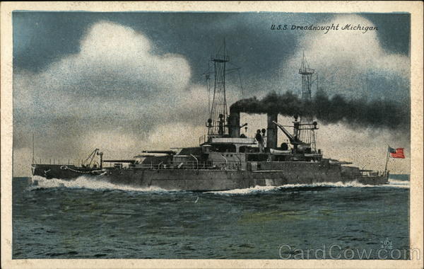 | U. S. S. Dreadnought MICHIGAN. Displacement, 17,617 tons; speed, 18.79 knots; H.P. 16,016. Length 452 ft. 9 in., breadth 80 ft. 2 1/2 ins. Officers 86, Blue Jackets 671, Marines 56. Carries eight 12 in. guns, twenty-two 3 in., two 3 in. anti-aircraft, two 21 in. torpedo tubes |