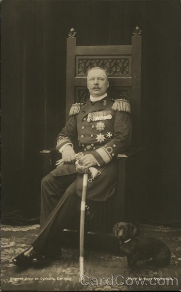 German Emperor and King of Prussia Wilhelm II in the Netherlands after fleeing Germany in 1918 with a Dachshund by his side