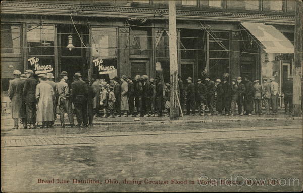 Front: 115 Kroger Kroger (10 LADIES Bread Line Hamilton, Ohio, during Greatest Flood in Worlds History, March 1913. Back: Kraemer to. Cincinnati. POSTCARD