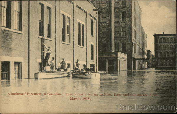 Front: Cincinnati Firemen in Gasoline Launch ready to run to Fire, Race and Commerce Flood March 1913. Back: Art 54 76 Cincinnati POSTCARD