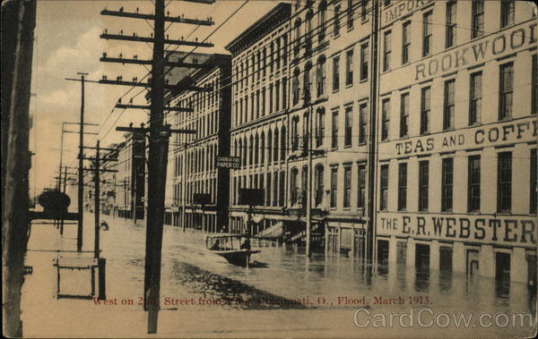 Front: 11 GARBER FOX PAPER CO. West on 2 Street froid ON MINOR & GRCERS IMPL ROOKWOOD TEAS AND COFFE THE E.R.WEBSTER cinnati, O., Flood, March 1913. Back: raemer Art Cincinnati Kre POSTCARD