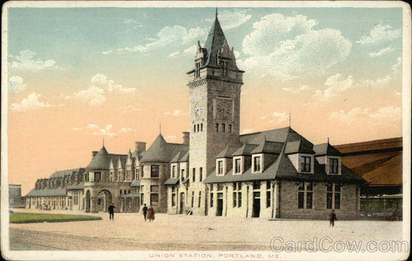 Front: 007 hi 生 UNION STATION, PORTLAND, ME. 四 Back: d.M G-4 The Leighton & Valentine Co., N.Y. City. THROUGHOUT FAMOUS QUALITY TRADE MARK. HE WORLD 2 Qu 196 Ray & China