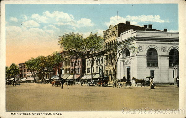 Front: MAIN STREET, GREENFIELD, MASS. Stand Back: PUBLISHED BY CHAS. W. HUGHES, MECHANICVILLE, N. Y. STAR QUALITY FOR WRITING MESSAGES MERICAN ART A-63270 ADO 1048 THIS SPACE FOR ADDRESS ONLY.