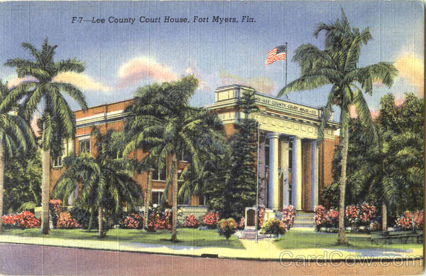 Front: F-7-Lee County Court House, Fort Myers, Fla. D-LEE COUNTY COURT HOUSE-S Back: Ft. Myers, Florida, winter home of Thomas A. Edison, is noted for its beautiful majestic royal palms. 7A-H1524 M. E. RUSSELL, SARASOTA, FLORIDA