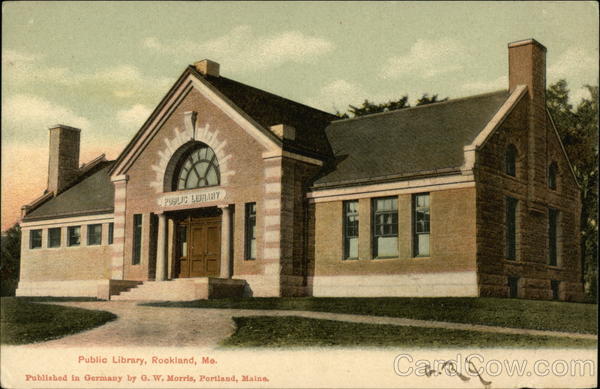 Front: TE PUBLIC LIBRARY Public Library, Rockland, Me. Published in Germany by G. W. Morris, Portland, Maine. 6.R2 Back: 400 One Cent for United States and Island Possessions, Cuba, Canada and for Foreign. COLLECTION OF N. C. BAKER 87189