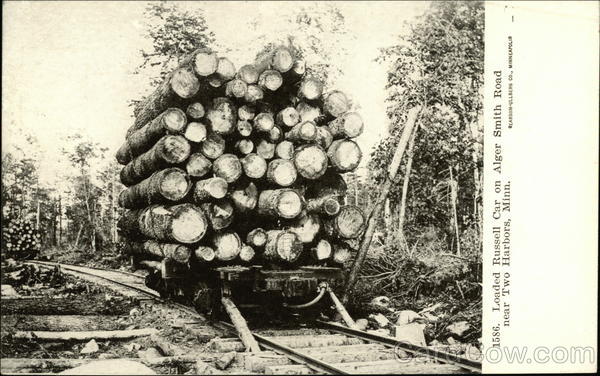 Front: 1586. Loaded Russell Car on Alger Smith Road near Two Harbors, Minn. BEARSON-ULLBERG CO., MINNEAPOLIS Back: Place 1c Foreign 2c