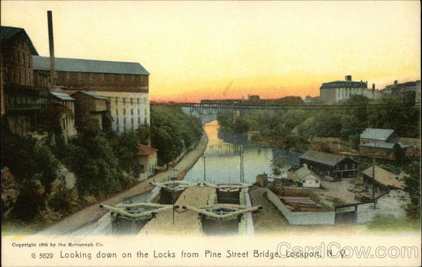 Front: ### Copyright 1905 by the Rotograph Co. G 5629 Looking down on the Locks from Pine Street Bridge, Lockport, N. D. Back: Germany.) The Rotograph Co., N. Y., City. PRINT Two cents