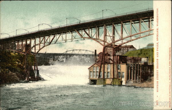 Front: 463 MONROE STREET BRIDGE AND FALLS, SPOKANE, WASHINGTON. EDWARD H. MITCHELL, PUBLISHER, SAN FRANCISCO, Back: Post Card- TWO CENTS