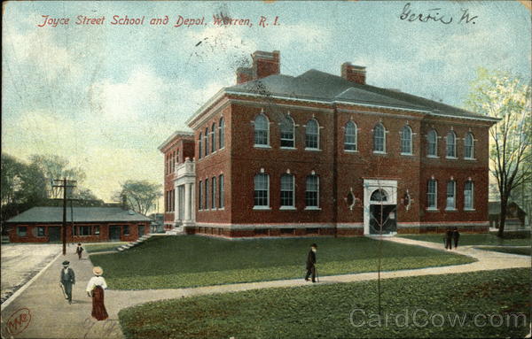 Front: We Joyce Street School and Depot, Wren, R. I. Geroic W. 11 Back: No. 7658. Made in Germany. Twe Posto CaceRRE 10 JUL JUL 8 /-AM 19 06 MASS Опла Mies Berthe Moff Ateleboro UNITED STATES OF MUP AMERICA U 1706 FRANKLIN 1790 M. asst.