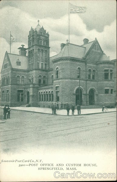 Front: 9.0 Souvenir Post Card Co.,N.Y. 11 3901-POST OFFICE AND CUSTOM HOUSE, SPRINGFIELD, MASS. fi Back: 1907 undivided back, Green Tint old Springfield, 125. TWO CENTS