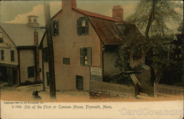 Front: FORMER ARDINGSTABLE SITE OF THE FIRST OR COMMON HOUSE 1620 Copyright 1905 by the Rotograph Co. G 7326 Site of the First or Common House, Plymouth, Mass, Back: (You The Rotograph Co., N. Y. City. (Germany.) AIN Two cents