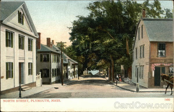 Front: NORTH STREET, PLYMOUTH, MASS. 1480 Back: Made in Germany. A. C. Bosselman & Co., New York, 3 Post Card. 300 One Cent for United States, and Island Possessions, Cuba, Canada and For Foreign.