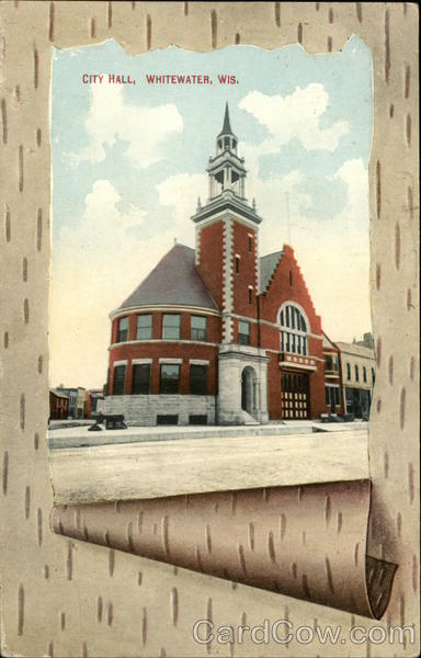 Front: CITY HALL, WHITEWATER, WIS. 11 Back: very pretty! Thanks Whitewater, Wie. (Miss) may teases your card. It was MITEH /hay M 730AM WIS Post Gard Miss Bertha A. Goff attleboro Mass