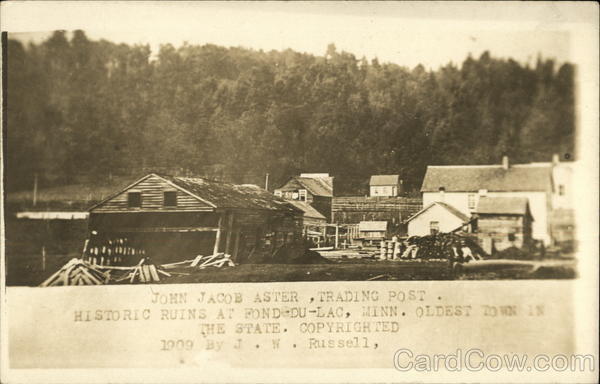 E FI JOHN JACOB ASTER ,TRADING POST . HISTORIC RUINS AT FOND DU-LAC, MINN. OLDEST TOWN IN THE STATE. COPYRIGHTED 1909 By J W. Russell,