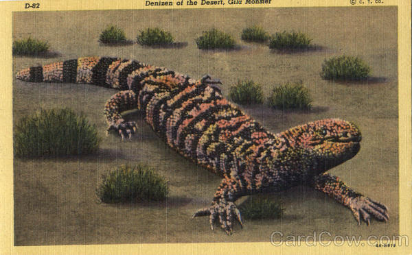 Front: Denizen of the Desert, Gila Monster D-82 4A-H919 Back: DISTRIBUTED BY LOLLESGARD SPECIALTY CO., TUCSON, ARIZONA