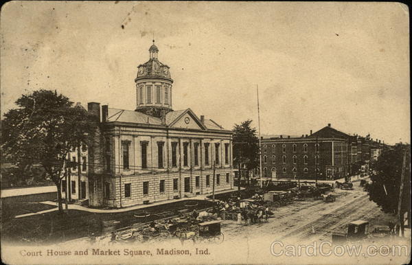 Front: FF II Court House and Market Square, Madison, Ind. ↑↑↑ 2000 1 스스 CIC GE 400,956 Back: огорц Published by Charles Kahn, Main St., Madison, SOUVENIR POST GARSON R.R.2 630AM FFP16 1913 нам Miss Maggie Hash Triss. Lapurt Ind