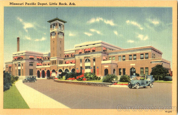 Front: Missouri Pacific Depot, Little Rock. Ark. 65 208 Back: MADE IN U. S. A *TICHNOR QUALITY VIEWS REG. U.S. PAT, OFF. MADE ONLY BY TICHNOR BROS., INC., BOSTON, MASS, PUB. BY A. KARCHER CANDY CO., LITTLE ROCK, ARK.