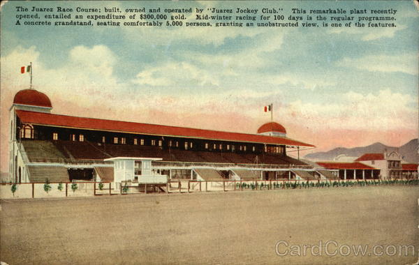 Built, owned and operated by Juarez Jockey Club. This remarkable plant recently opened, entailed an expenditure of $300,000 gold. Mid-winter racing for 100 days is the regular programme. A concrete grandstand, seating comfortably 5,000 persons, granting an unobstructed view, is one of the features |