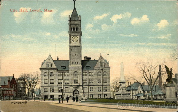 Front: City Hall, Lowell, Mass. P-24954 W ***** f Back: The Valentine-Souvenir Co., New York. Printed in U. S. A. THROUGHOUT SUPERIOR QUALITY THE WORLD FAMOUS CARD
