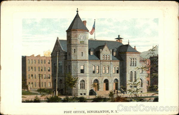 Front: 1111112 3111212 FI AF 11 POST OFFICE, BINGHAMTON, N. Y. 11 1 Back: SOUVENIR POST CARD Co., NEW YORK. 1053 Post Gard 1,25 Ms. J. S. Wood. что Many thanks for petty cards just will like these and call agan Уфора you soon. лес