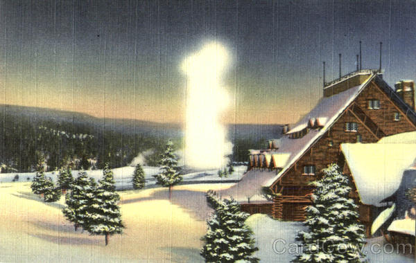 1225 WINTER SCENE IN YELLOWSTONE PARK SHOWING OLD FAITHFUL GEYSER AND OLD FAITHFUL INN ZA-H3886 SANBORN SOUVENIR CO., DENVER, COLO. C.T. ART.COLORTONE,