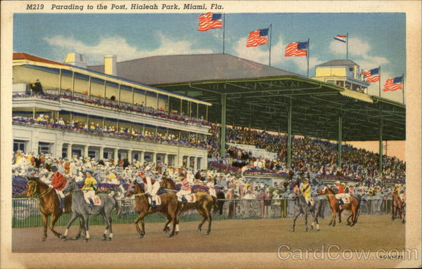 Front: M219 Parading to the Post, Hialeah Park, Miami, Fla. 8 A-HI079 Back: 20 **C.T. ART-COLORTONEā REG.U.S. PAT. OFF. MADE ONLY BY CURT TEICH & Co., INC., CHICAGO 2/20/39 THOMAS R. WEST, MIAMI, FLA.
