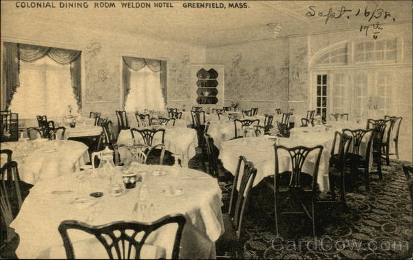 Front: COLONIAL DINING ROOM WELDON HOTEL GREEN FIELD, MASS. Back: Published by THE COLLOTYPE Co., Elizabeth, N.J. and N. Y.