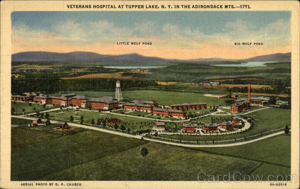 Front: VETERANS HOSPITAL AT TUPPER LAKE, N. Y. IN THE ADIRONDACK MTS.-17TL LITTLE WOLF POND BIG WOLF POND AERIAL PHOTO BY D. P. CHURCH 6A-H2518 Back: C. W. HUGHES & CO., INC., MECHANICVILLE, N. Y.