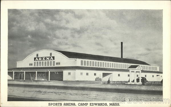 Front: ARENA 00000 SPORTS ARENA, CAMP EDWARDS, MASS. :000000000e0 Back: NAME RANK UNITED STATES ARMY THE HAMENT PUBLISHING CO., BROOKLYN, N. Y. 2 2
