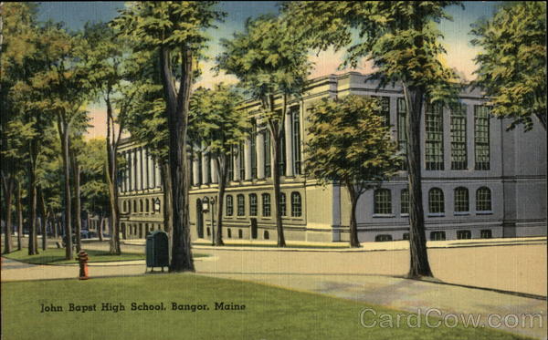 Front: John Bapst High School, Bangor. Maine Back: MADE IN U, S. A 400 "TICHNOR QUALITY VIEWS" REG. U.S. PAT, OFF. MADE ONLY BY TICHNOR BROS., INC., BOSTON, MASS. 74834 PUB. BY BANGOR NEWS AGENCY, BANGOR, MAINE