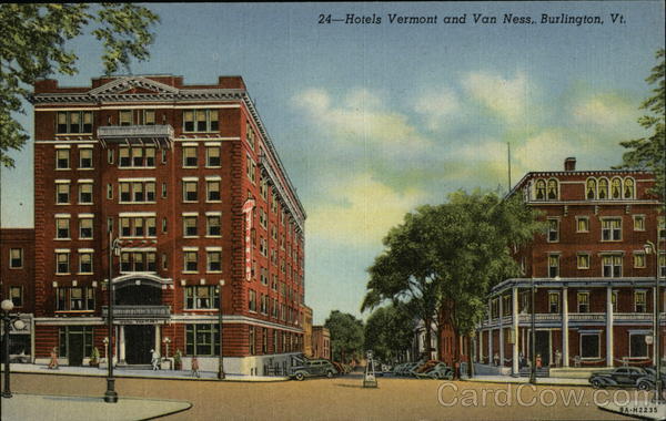 Front: 24-Hotels Vermont and Van Ness.. Burlington, Vt. 22 E2 9A-H2235 Back: C. W. HUGHES & CO., INC., MECHANICVILLE, N. Y.