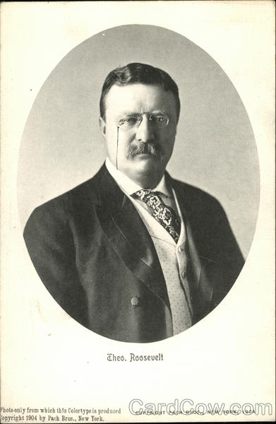 Front: Theo. Roosevelt Photo only from which this Colortype is produced Copyright 1904 by Pach Bros., New York. COPYRIGHT PACH BROS., NEW YORK, 1904 Back: CELEBRITY SERIES. U. 8. S. P. C. Co. No. I 6. 12-