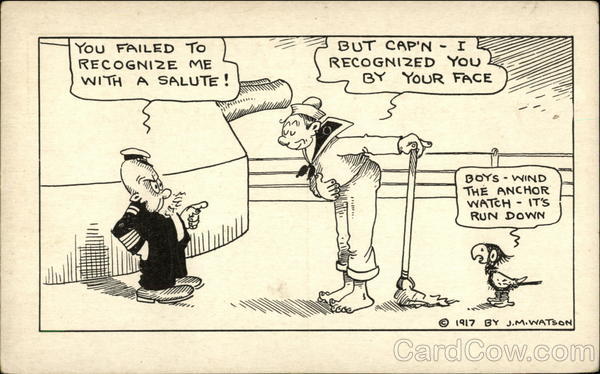 Front: You FAILED TO RECOGNIZE ME WITH A SALUTE! 2002 luu UU BUT CAP'N - I RECOGNIZED YOU BY YOUR FACE Face BOYS-WIND THE ANCHOR WATCH IT'S RUN DOWN 1917 BY J.M.WATSON Back: 100 Published by The Chessler Company, Baltimore, Md. FOR ADDRESS ONLY