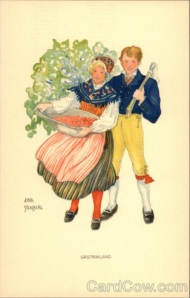 Front: AINA STENBERG GÄSTRIKLAND Back: SVENSKT NATIONALKORT NR 100. MADE IN SWEDEN COPYRIGHT ESKIL HOLM, STOCKHOLM