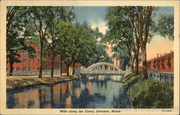 Front: Mills along the Canal, Lewiston, Maine 7A-H 3861 Back: J. J. MULLANE NEWS CO., LEWISTON, MAINE 300