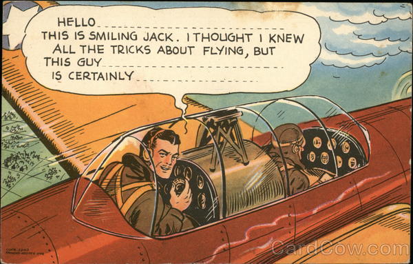 Front: HELLO THIS IS SMILING JACK. ITHOUGHT I KNEW ALL THE TRICKS ABOUT FLYING, BUT THIS GUY IS CERTAINLY.. COPR.1943 FAMOUS ARTnsTS SVN. Back: NAME & RANK $6. SERIAL NO. 3 es BRANCH OF SERVICE APPROVED ADDRESS
