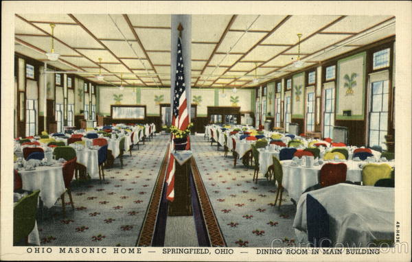 Front: OHIO MASONIC HOME ОНIO SPRINGFIELD, OHIO DINING ROOM IN MAIN BUILDING 4B-H436 Back: 054 3- DINING ROOM IN MAIN BUILDING OHIO MASONIC HOME SPRINGFIELD, OHIO Capacity 200. This is the largest of five din- ing rooms in the Home.
