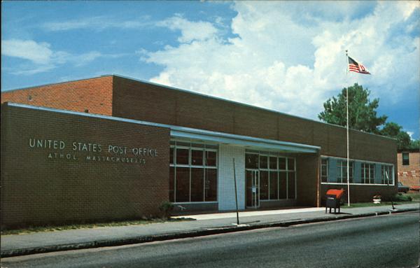 Front: UNITED STATES POST OFFICE ATHOL. MASSACHUSETTS Back: 7808-C ATHOL, MASS. U.S. POST OFFICE BUILDING dp Pub. by NATCOR, Natural Color Cards Co., Ridgefield Park, New Jersey DEXTER PRESS, INC. WEST NYACK, NEW YORK HERE