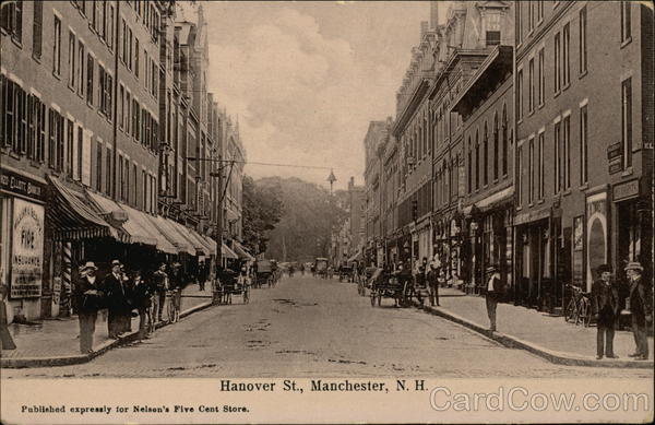 Front: NZD ELLIOTT, BANKER WHIT FIRE INSURANCE PATR AYON ISO PEW BRON/STEEL Hanover St., Manchester, N. H. Published expressly for Nelson's Five Cent Store. COMPE WIND SLEADINIS Brst EL Back: POST CARD