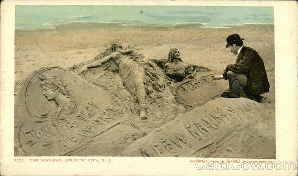 Front: 5371. FAGET TEVE WORKS THE SANDMAN, ATLANTIC CITY, N. J. LESSON GA FW GRUIM STYAN COPYRIGHT, 1900, BY DETROIT PHOTOGRAPHIC CO. Back: AND CANADA, FOREIGN, TWO CENTS.