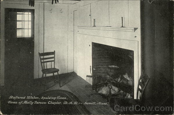 Front: Raftered Kitchen, Spalding House. Home of Molly Varnum Chapter. D.A.R. bowell, Mass. Back: Domestic, 1c. Foreign, 2c.