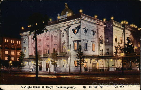 Front: BUNU 三佳职 屋里 IEN 00 HI A Night Scenc at Tokyo Teikokugekijoj 塲劇國帝 (京 原) Back: union Postale universelle. MADE IN JAPAN 22mmかは便郵
