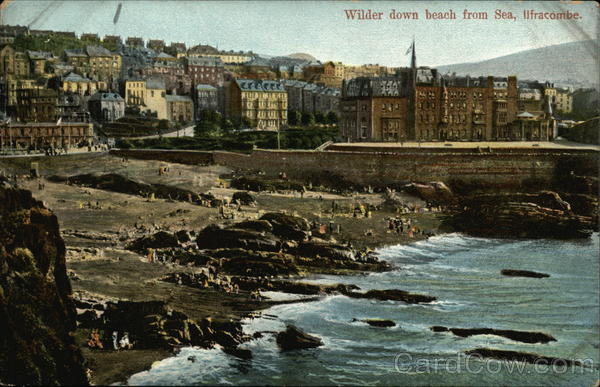 Front: 推薦 WAND Wilder down beach from Sea, Ilfracombe. 随 Back: For INLAND Postage only this space may be used for communication. No. 874 Copyright. in Saxony. Ingram Clark & Co., Ltd Printers, Ilfracombe