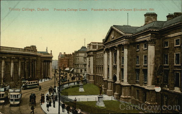 Front: Trinity College, Dublin Fronting College Green. Founded by Charter of Queen Elizabeth, 1591 ROTOXO 67 0000 zuu Back: Valentine, Deblin VALENTINE'S SERIES FAMOUS THROUGHOUT WORLD CARD. 2