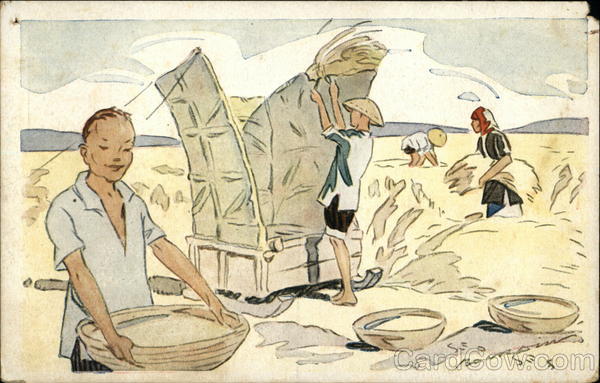 CARTE POSTALE LE RIZ D'INDO-CHINE 5. Battage du riz.