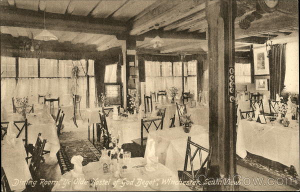 Front: AF 16 Dining Room "Ye Olde ostel of God Begot", Winchester South View Back: POST CARD, This Space may be used for Communication. Affix Half penny Stamp.